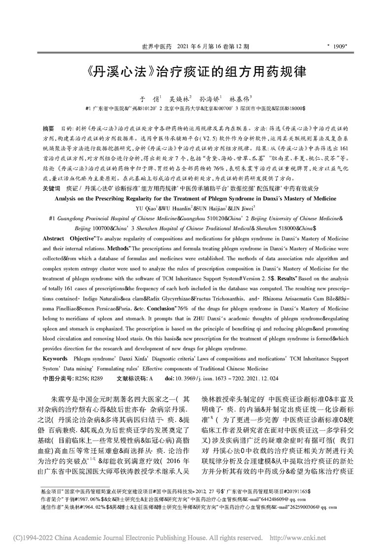 《丹溪心法》治疗痰证的组方用药规律_于俏